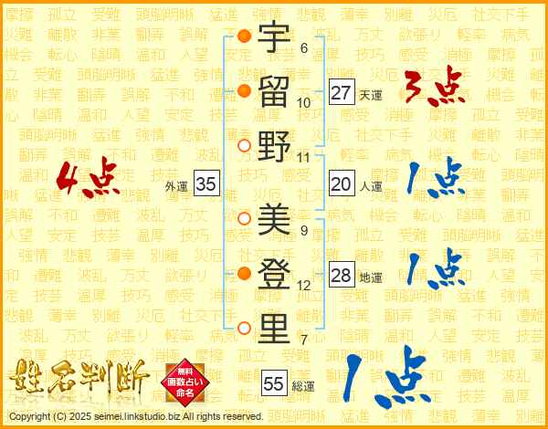宇(6画)留(10画)野(11画) 美(9画)登(12画)里(7画)