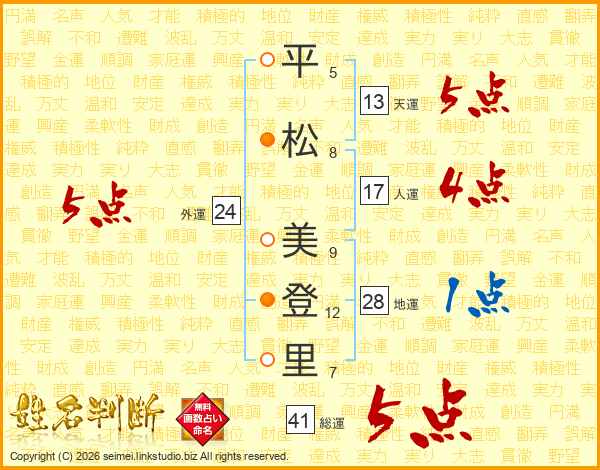 平(5画)松(8画) 美(9画)登(12画)里(7画)
