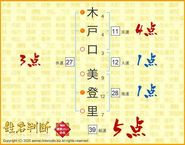 木(4画)戸(4画)口(3画) 美(9画)登(12画)里(7画)