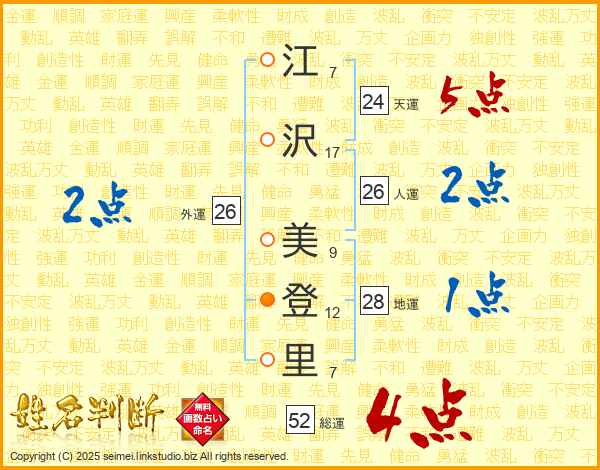 江(7画)沢(17画) 美(9画)登(12画)里(7画)