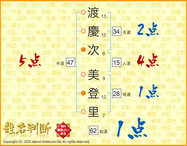 渡(13画)慶(15画)次(6画) 美(9画)登(12画)里(7画)