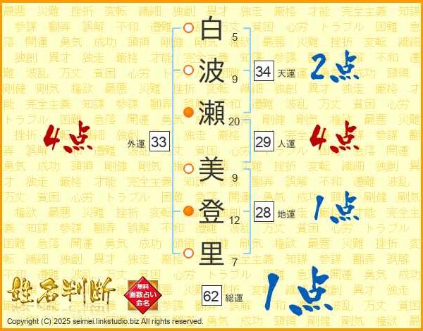 白(5画)波(9画)瀬(20画) 美(9画)登(12画)里(7画)
