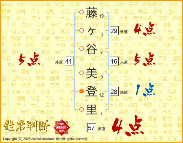 藤ヶ谷美登里さんの天運は29画の4点!