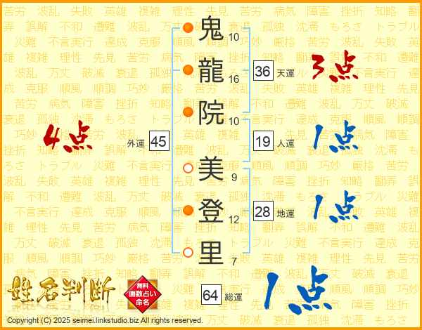 鬼(10画)龍(16画)院(10画) 美(9画)登(12画)里(7画)