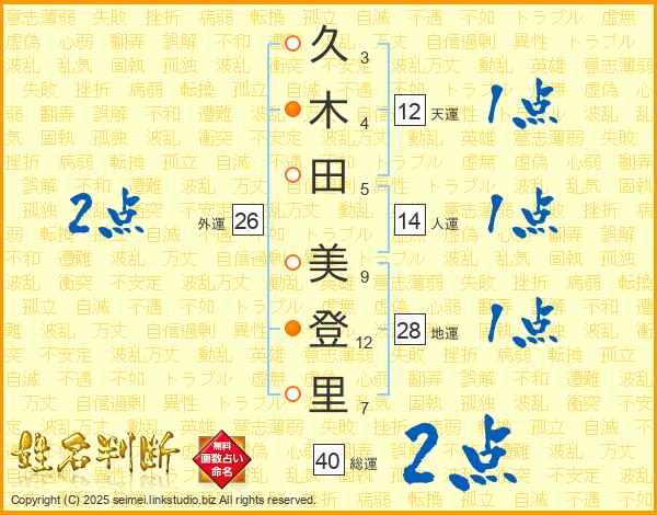 久(3画)木(4画)田(5画) 美(9画)登(12画)里(7画)