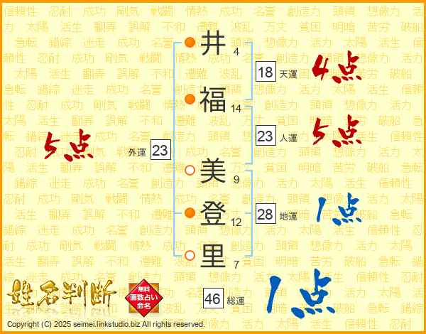 井(4画)福(14画) 美(9画)登(12画)里(7画)