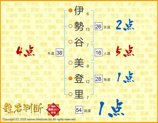 伊(6画)勢(13画)谷(7画) 美(9画)登(12画)里(7画)