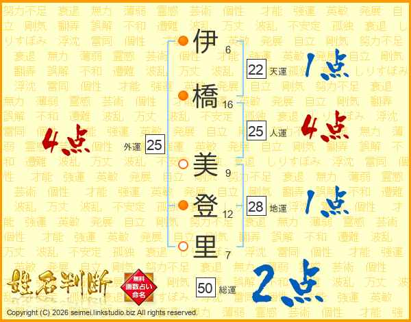 伊(6画)橋(16画) 美(9画)登(12画)里(7画)