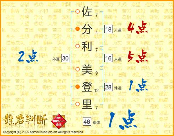 佐(7画)分(4画)利(7画) 美(9画)登(12画)里(7画)