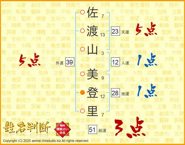 佐(7画)渡(13画)山(3画) 美(9画)登(12画)里(7画)