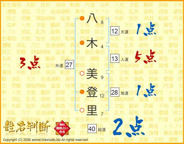八(8画)木(4画) 美(9画)登(12画)里(7画)