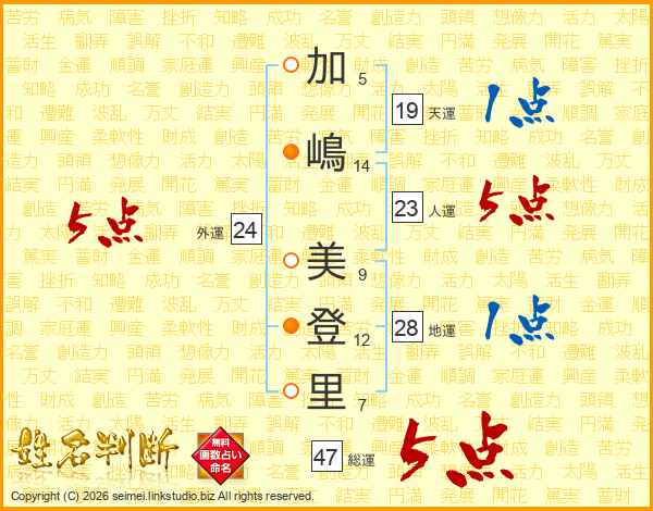 加(5画)嶋(14画) 美(9画)登(12画)里(7画)