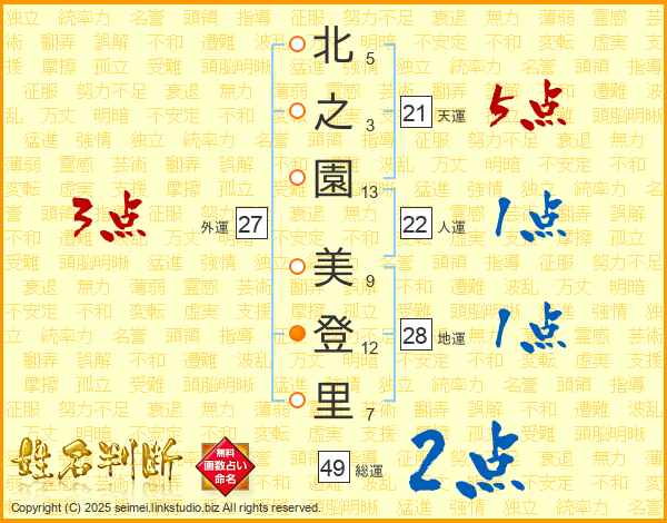 北(5画)之(3画)園(13画) 美(9画)登(12画)里(7画)