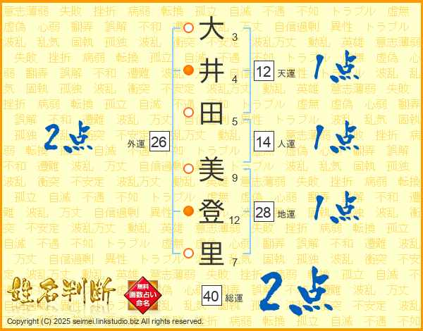 大(3画)井(4画)田(5画) 美(9画)登(12画)里(7画)