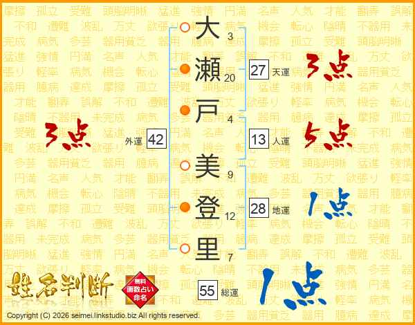 大(3画)瀬(20画)戸(4画) 美(9画)登(12画)里(7画)