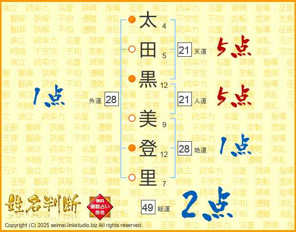 太(4画)田(5画)黒(12画) 美(9画)登(12画)里(7画)