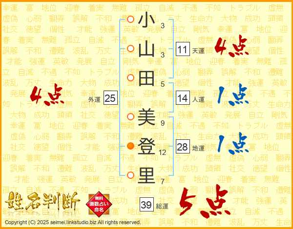 小(3画)山(3画)田(5画) 美(9画)登(12画)里(7画)