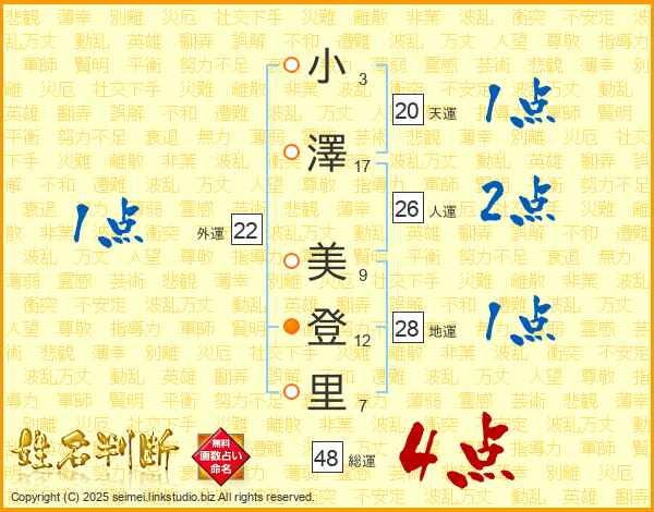 小(3画)澤(17画)  美(9画)登(12画)里(7画)