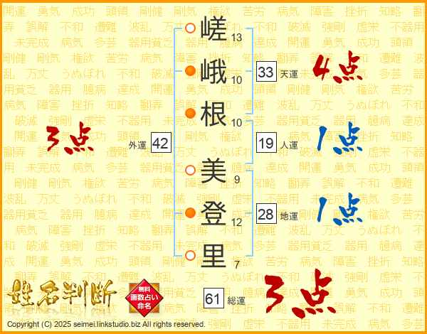 嵯(13画)峨(10画)根(10画) 美(9画)登(12画)里(7画)
