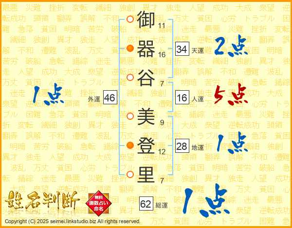 御(11画)器(16画)谷(7画) 美(9画)登(12画)里(7画)