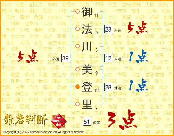 御法川美登里さんの総運は51画の3点