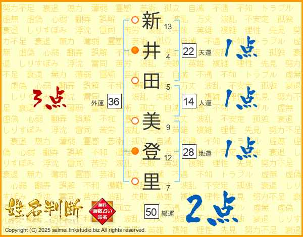 新(13画)井(4画)田(5画) 美(9画)登(12画)里(7画)