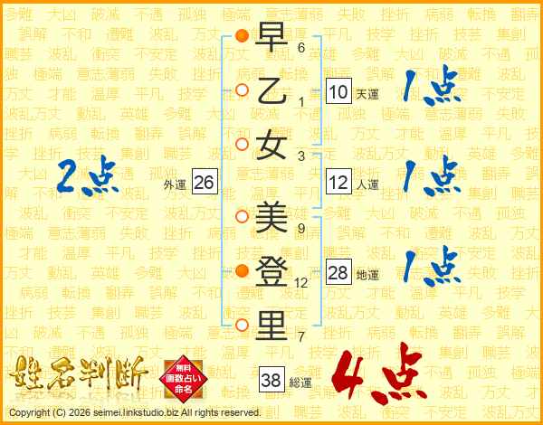 早(6画)乙(1画)女(3画) 美(9画)登(12画)里(7画)