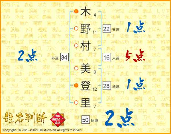 木(4画)野(11画)村(7画) 美(9画)登(12画)里(7画)