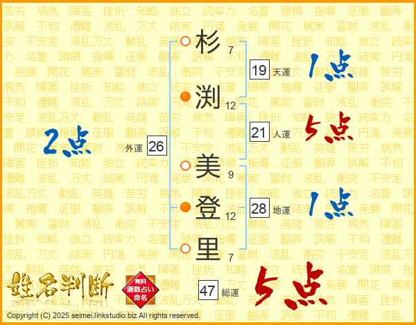 杉(7画)渕(12画) 美(9画)登(12画)里(7画)