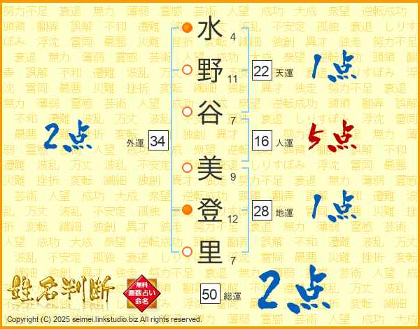 水(4画)野(11画)谷(7画)  美(9画)登(12画)里(7画)