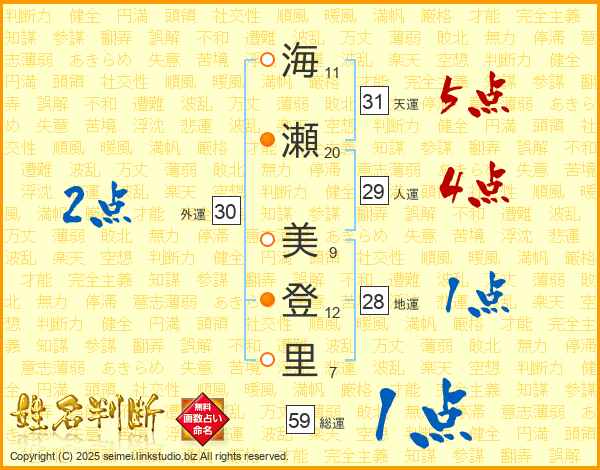 海(11画)瀬(20画) 美(9画)登(12画)里(7画)