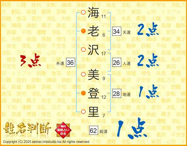 海(11画)老(6画)沢(17画) 美(9画)登(12画)里(7画)