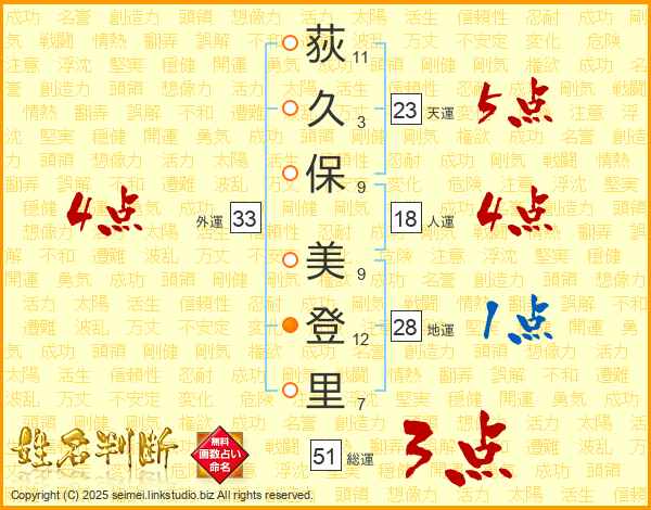 荻久保美登里さんの外運は33画の4点!