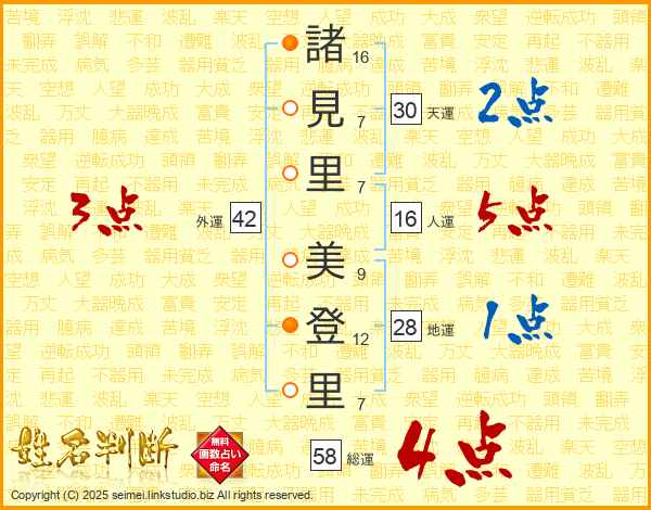 諸(16画)見(7画)里(7画) 美(9画)登(12画)里(7画)