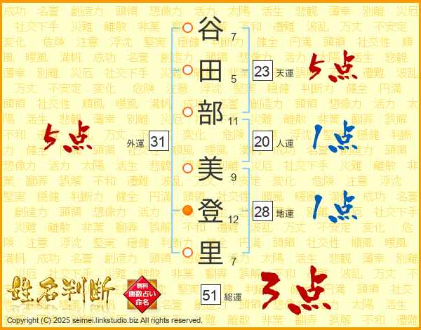 谷(7画)田(5画)部(11画) 美(9画)登(12画)里(7画)