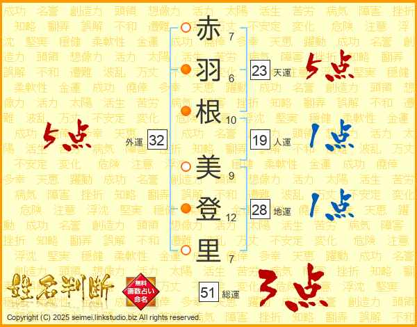 赤(7画)羽(6画)根(10画) 美(9画)登(12画)里(7画)
