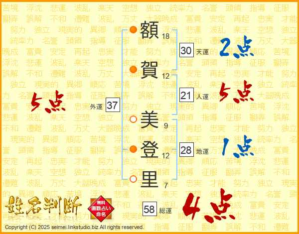 額(18画)賀(12画) 美(9画)登(12画)里(7画)