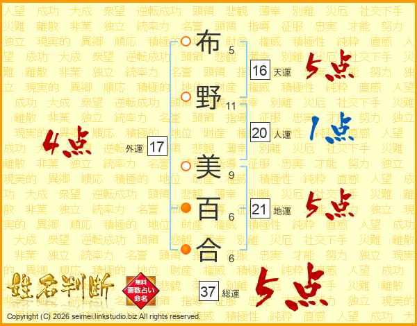 布(5画)野(11画) 美(9画)百(6画)合(6画)