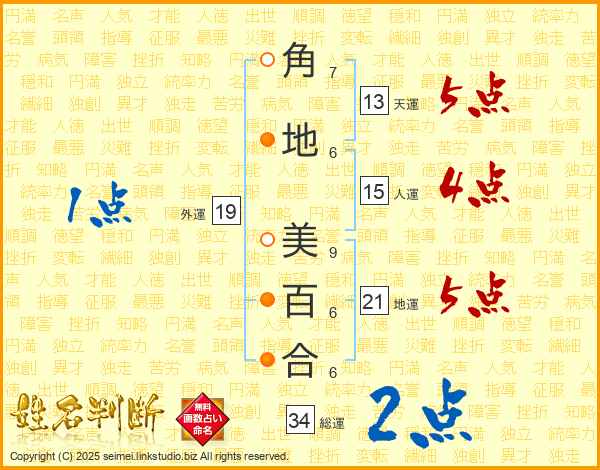 角(7画)地(6画) 美(9画)百(6画)合(6画)