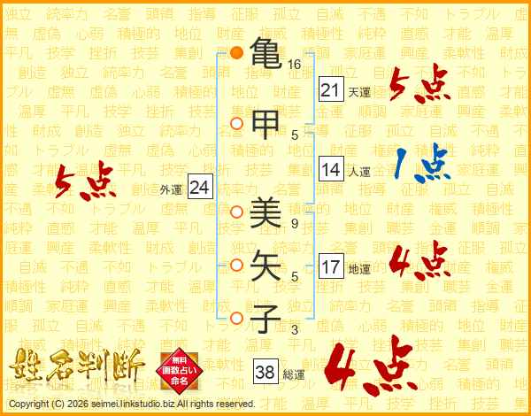 亀(16画)甲(5画) 美(9画)矢(5画)子(3画)
