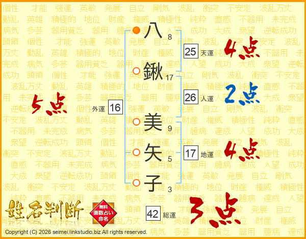八(8画)鍬(17画) 美(9画)矢(5画)子(3画)