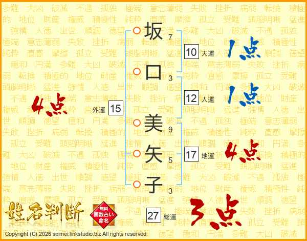 坂(7画)口(3画) 美(9画)矢(5画)子(3画)