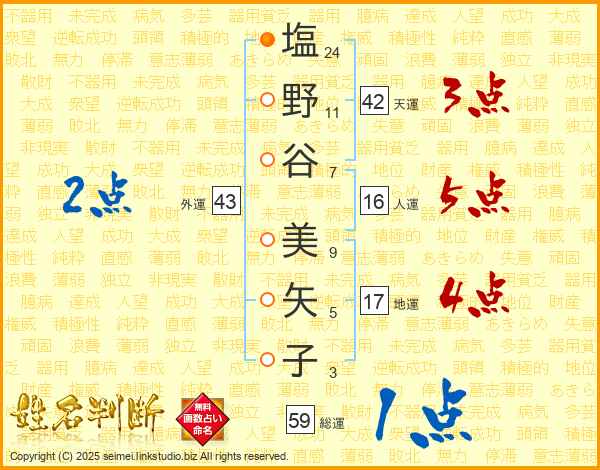 塩(24画)野(11画)谷(7画) 美(9画)矢(5画)子(3画)