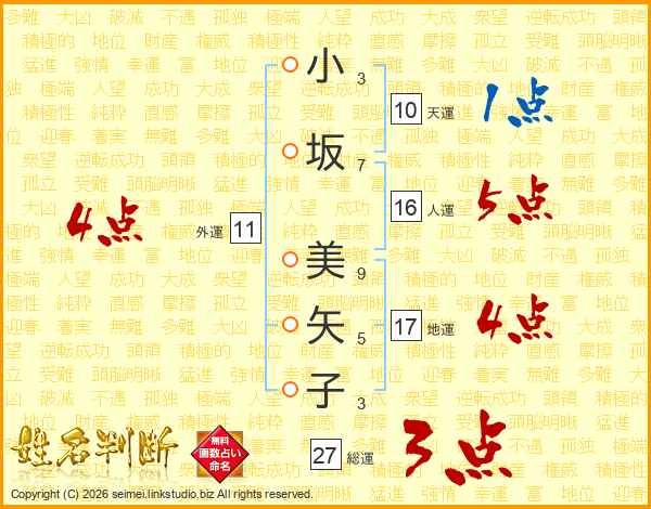 小(3画)坂(7画) 美(9画)矢(5画)子(3画)