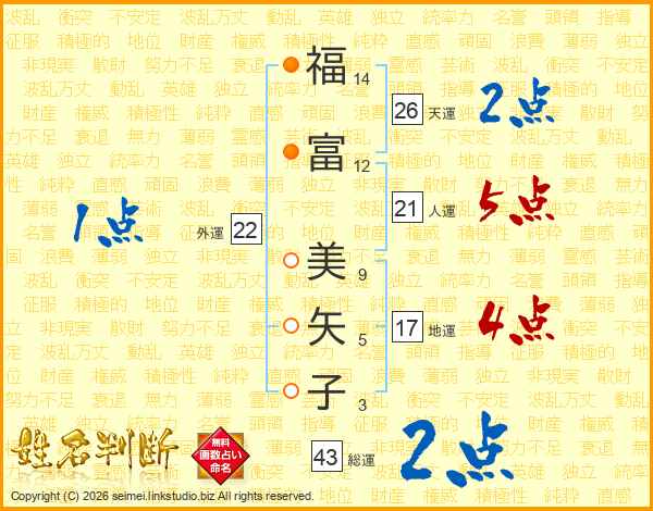 福(14画)富(12画) 美(9画)矢(5画)子(3画)