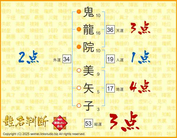 鬼(10画)龍(16画)院(10画) 美(9画)矢(5画)子(3画)