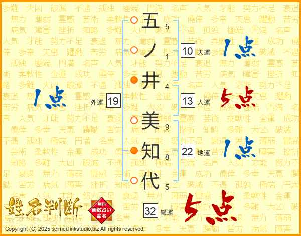 五(5画)ノ(1画)井(4画) 美(9画)知(8画)代(5画)