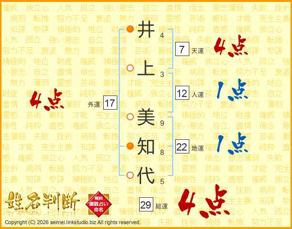 井(4画)上(3画) 美(9画)知(8画)代(5画)