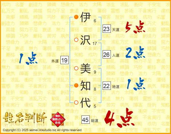 伊(6画)沢(17画) 美(9画)知(8画)代(5画)