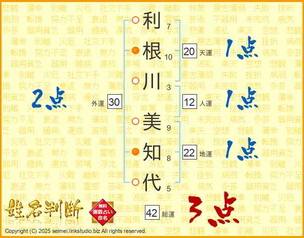 利(7画)根(10画)川(3画) 美(9画)知(8画)代(5画)